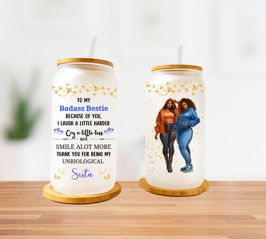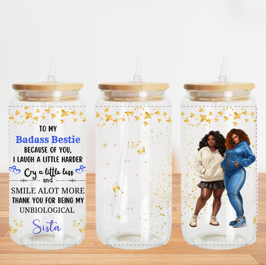 Badass Besties Blue Sparkles - Taza de vidrio CLARO